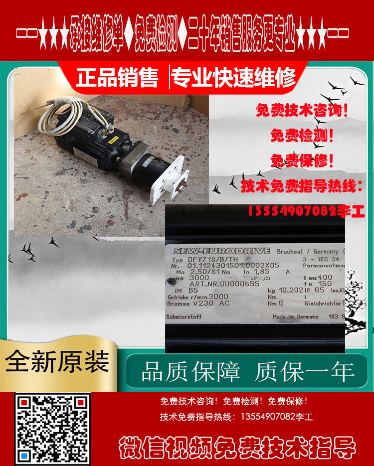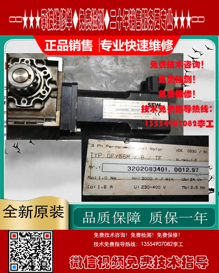 DFY71S/B/TH SEW赛威伺服电机烧线圈绕组、航空插头损坏、原点位置不对,编码器调试/调零位、更换轴承、轴承槽磨损、转子断裂,轴断裂、齿轮槽磨损等、伺服电机销售维修,主轴伺服马达故障处理,编码器销售维修¥ 0.00立即购买